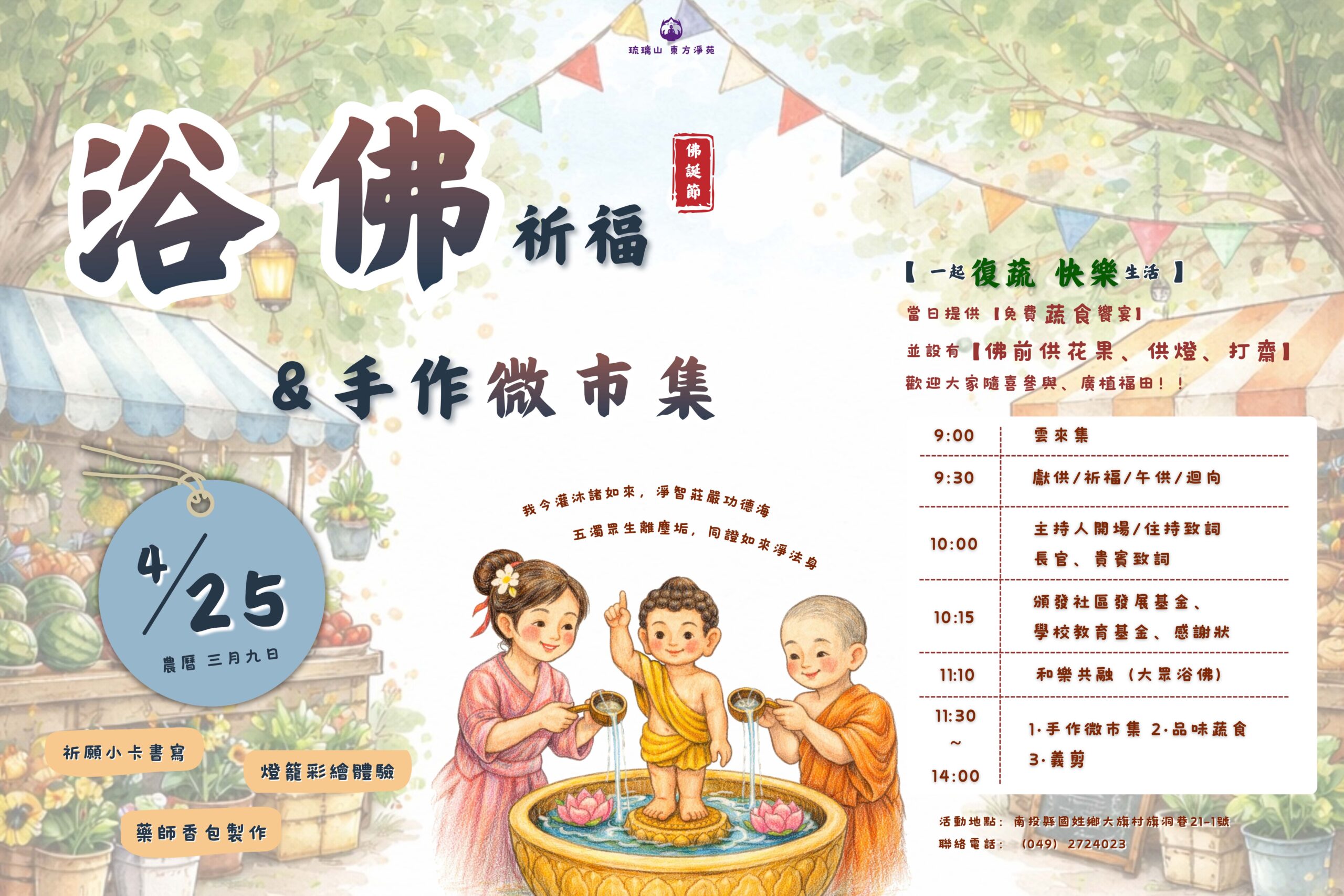 在春意盎然的四月,誠摯邀請您與家人朋友一同參與 佛誕浴佛祈福活動。 透過浴佛儀式,象徵洗滌煩惱、淨化身心, 在溫暖的氛圍中為自己與家人祈願平安。