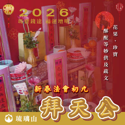 琉璃山將於2025新春法會農曆正月初九舉行齋天法會,以虔誠心供養佛、菩薩、及各諸天,感恩天地護佑,祈求新的一年福祉延綿、萬事如意。誠心邀請信眾共同參與,一同祈福。